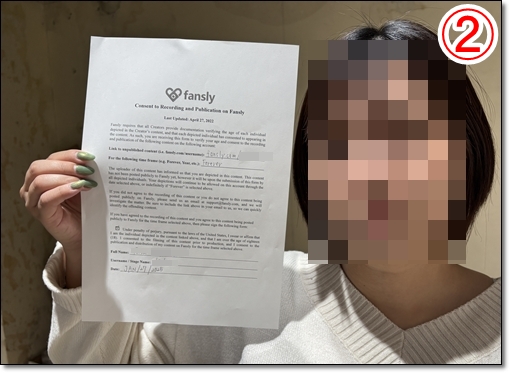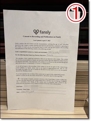 あなたは、弊社が開設したFanslyアカウントに共演者として登録されます。そのためには、各サイト専用のCo-performer release formをあなたが印刷し、適切に手書きで記入し、写真撮影することが必要です。